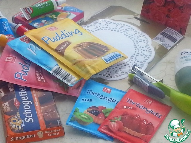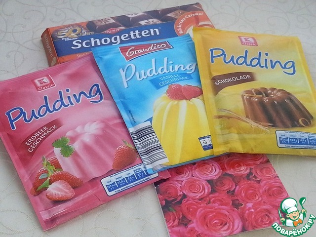 Пудинги: ванильный, клубничный и шоколадный. Стыдно признаться, но никогда не готовила их. Если у кого есть опыт приготовления, поделитесь, пожалуйста. А то ребенок бегает за мной со словами "мама-приготовь сейчас". А также, Лариса прислала очень вкусную шоколадку, которая тает во рту