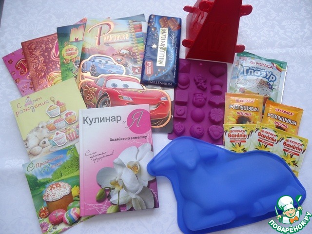 Ура-а-а-а!!!! Я сегодня получила посылочку от Аллы 1976!!! Когда распечатывала посылку, такой доносился аромат ванили... А вот и подарки: раскраски для детей, шоколад, разрыхлитель, ванилин, глазурь, форма для конфет - я о такой мечтала, форма для творожной пасхи - все никак не могла приобрести, очень красивая силиконовая форма "Ягненок", а еще интересная кулинарная книга, в которой не только размещены рецепты, но и много страничек для записей своих рецептов! Аллочка, спасибо тебе, дорогая, за прекрасные подарки и внимание! Ты не представляешь, как у меня поднялось настроение!