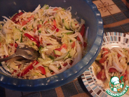 Приготовила овощной салат из пекинской капусты, болгарского перца, помидоров, огурца, зелёной редьки. Заправила салат оливковым маслом.