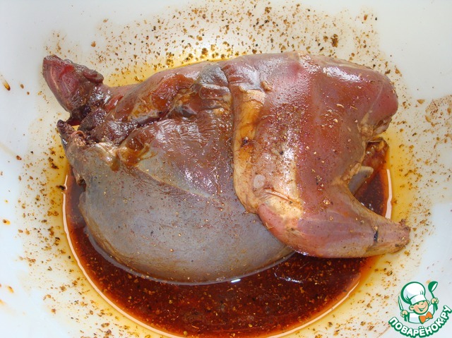 Отчитываюсь: так получилось, пришли усталые и голодные, а глухарь как раз поджидал своего часа в холодильнике. Муж не долго думая замариновал его (масло для гриля, соя, красное вино, майоран, лимонный перец, имбирь).