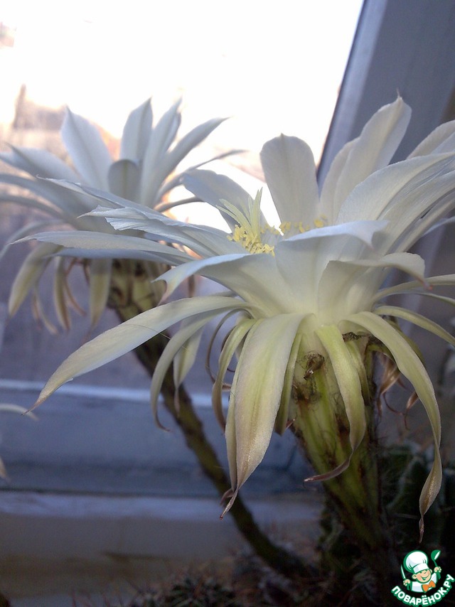 Соседняя организация переезжала в другое здание и отдала нам, так скажем, на воспитание свои цветы. В их числе был и кактус. Чахлый такой... думали выбросим. Мы с девчонками на работе, думаю, как и многие другие, любим почаёвничать))) Иногда удавалось выкроить из рабочего времени пятиминутку, чтоб порадовать себя этим отдыхом. Комната с раковиной, где можно было бы ополоснуть кружки после очередного чаепития находилась далеко от того кабинета, в котором собственно и проходила наша трапеза. Поэтому, вскипятив воду в чайнике, мы кипяточком ополаскивали каждая свою кружечку и этот кипяточек выливали как раз в тот чахлый кактус. Если чай у кого был недопит- опять в кактус... Да простят меня любители этих прекрасных колючек! Издевательство, скажете вы! Ничего подобного! Наш кактус "одыбался" и до того полюбил совместное "чаепитие" и поливание кипяточком, что стал радовать цветами нас каждую неделю! Правда цветы всего сутки, но это такая нежность, это не передать словами! Вообщем, смотрите сами!