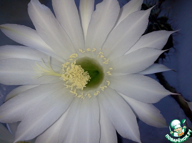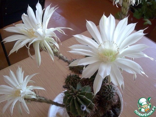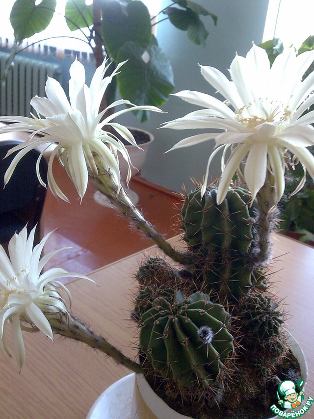 Соседняя организация переезжала в другое здание и отдала нам, так скажем, на воспитание свои цветы. В их числе был и кактус. Чахлый такой... думали выбросим. Мы с девчонками на работе, думаю, как и многие другие, любим почаёвничать))) Иногда удавалось выкроить из рабочего времени пятиминутку, чтоб порадовать себя этим отдыхом. Комната с раковиной, где можно было бы ополоснуть кружки после очередного чаепития находилась далеко от того кабинета, в котором собственно и проходила наша трапеза. Поэтому, вскипятив воду в чайнике, мы кипяточком ополаскивали каждая свою кружечку и этот кипяточек выливали как раз в тот чахлый кактус. Если чай у кого был недопит- опять в кактус... Да простят меня любители этих прекрасных колючек! Издевательство, скажете вы! Ничего подобного! Наш кактус "одыбался" и до того полюбил совместное "чаепитие" и поливание кипяточком, что стал радовать цветами нас каждую неделю! Правда цветы всего сутки, но это такая нежность, это не передать словами! Вообщем, смотрите сами!