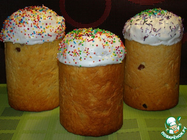 Еще: если сахар будет крупный, то она очень быстро осыпается. Я пробовала наносить глазурь на горячие куличи "методом окунания" (услышала в какой-то передаче такой совет, да и некоторые девочки так советовали, чтобы она не крошилась). Нанесла с горем пополам: кулич горячий, держать его не удобно, горячо, к тому же он мягкий, страшно сломать или сделать вмятину. Так вот, мои впечатления: да, глазурь быстрее подсыхает, но, только сверху (это не мешает ей слипаться, если куличи соприкоснулись друг с другом), поэтому нужно приловчиться, быстренько мазать и присыпать тут же присыпкой, так как потом она просто слетает с высохшего верхнего слоя. А самый главный минус: на следующий!!! день вся глазурь просто нагло слетела с кулича, не осталось ничего!!! Я была в шоке!!! У меня такого еще не было никогда. Куличу на главном фото в рецепте 10 дней и при этом мне удалось его разрезать и сфотографировать, причем глазурь практически целая. ВЫВОД ТАКОЙ: глазурь делаю из сахарной пудры и наношу только на остывший кулич!!!