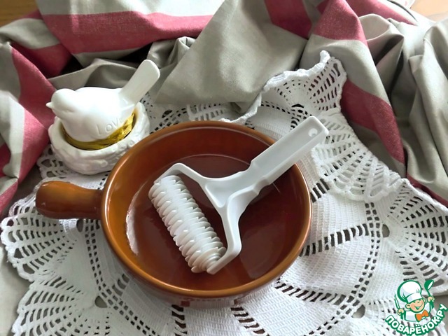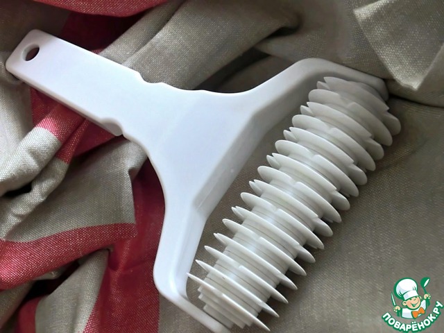 Ну, и валик для теста! Проводишь им по тесту, он разрезает тесто в шахматном порядке - для украшения пирогов! С валиком вообще связана смешная история. Я отправилась за ним на охоту, объездила 2 магазина, но нигде ничего подобного не видела. Мне пытались помочь, но я могла лишь сказать, что мне нужно нечто для теста и показывала руками, как я представляю себе валик. Потом я вспомнила, что у нас есть специализированный магазин, где продается все для кулинарии. Там один из продавцов (видимо, самый сообразительный) догадался по моему мычанию и размахиванию руками что мне нужно. И принес это чудо! Он, конечно, имеет какое-то официальное название, но я сказала, что мне уже не интересно, как его зовут!