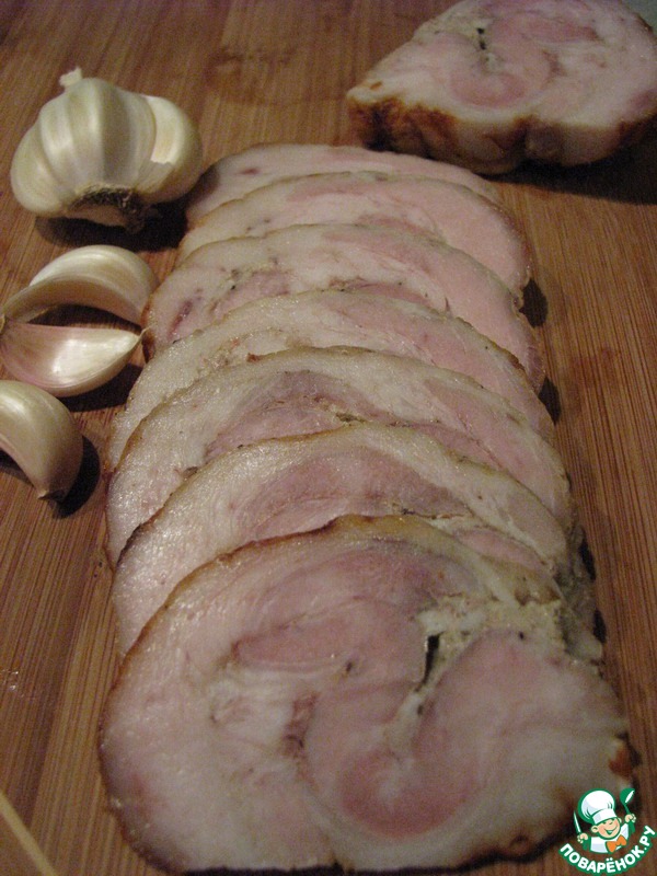 Сделать маринад: смешать майонез, горчицу, чеснок, пропущенный через пресс, любимые специи. Посолить, смазать этим маринадом и свернуть рулетом. Перевязать пищевой бечевкой, завернуть в 3 слоя фольги и запекать. Я запекала в аэрогриле при температуре 205 градусов 1 час 20 минут.
