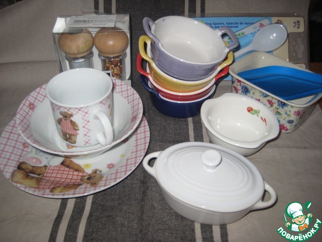 А это-мне набор мини-форм для запекания(наверное,что-то типа жульенниц).Четыре одинаковых,но с разным цветом,одна беленькая с крышечкой и одна прямоугольная с силиконовой крышкой(написано,что выдерживает очень низкие и очень высокие температуры)