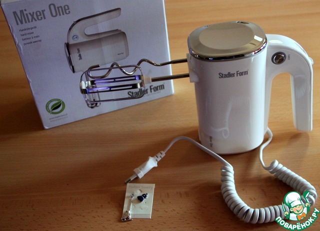 Благодаря Ларочке ларек я являюсь обладателем прекрасного подарка от сайта "Поварёнок" ! Это - миксер от Stadler Form, который Ларискин согласилась мне выслать!!! Никогда не думала, что буду настолько восхищаться незнакомой фирмой (немцы привычны к Сиеменсу, Бошу...)! Держу, как "отбойный молоток" в своих руках уже несколько дней подряд, вернувшись с гор, Альпийских гор
