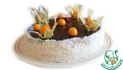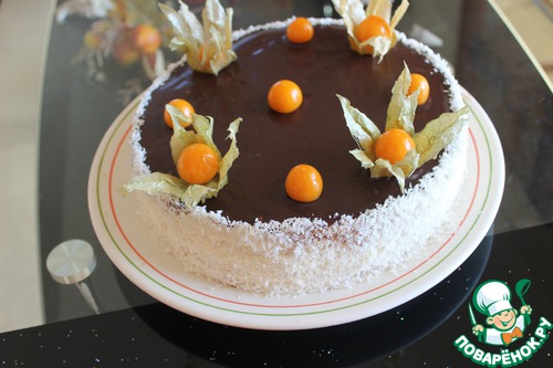 Затем заливаю верх. Шокол. глазурь: сливки разогреем добавим поломаный шоколад , размешаем хорошо и зальем верх. Даем постоять. Украшаем физалисом и бока кокосовой стружкой.Приятного аппетита!