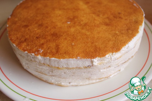 Промазываю коржи. Примерно по 2-3 ст.л. ложки на корж. Торт ставлю в холодильник, немного постоять. примерно 2 часа.