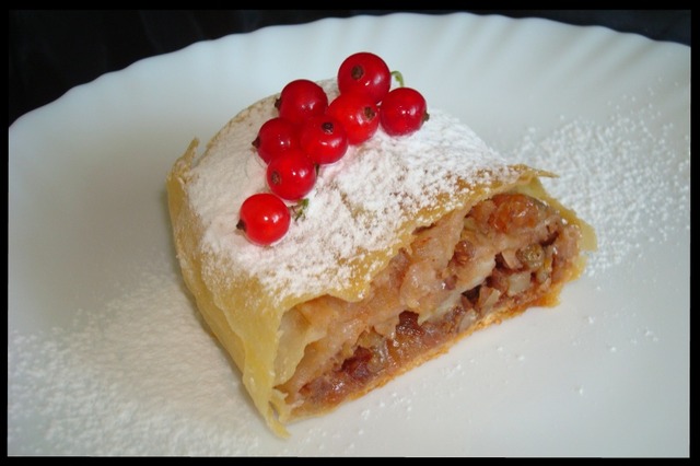 Этот с любимой начинкой яблоко+орехи+изюм+корица. За рецепт спасибо =Юлька= "Штрудель венский" https://www.povarenok.ru/recipes/show/61754/