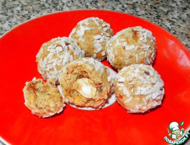 Из остатков крошки и крема получились конфеты, внутри орешек, обваляла в кокосе, вкусные получились