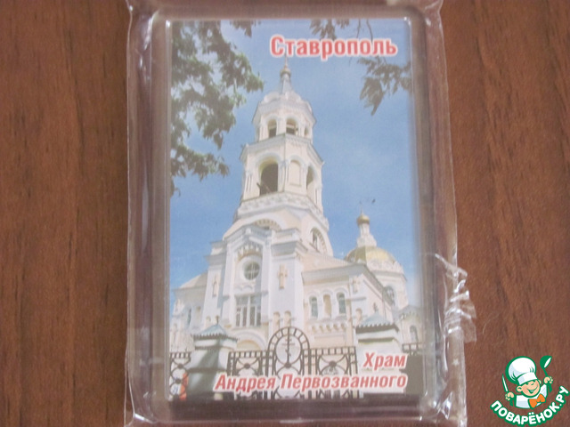 На полотенечке лежал кулёчек с красивыми штучками!К нему был приклеен магнитик!Это Женечкин Ставропольский край и На нём Храм Андрея Первозданного !