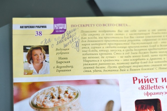 Нина работала в известном немецком журнале для русских эмигрантов, посвященном кухне. Девочки из нашего сайта работали вместе с Ниной, у Нины был целая рубрика в журнале. Вот и мне посчастливилось поработать вместе с Ниночкой! Нина любезно подписала мне свой авторский экземпляр. Это бесценный подарок, честное слово!
