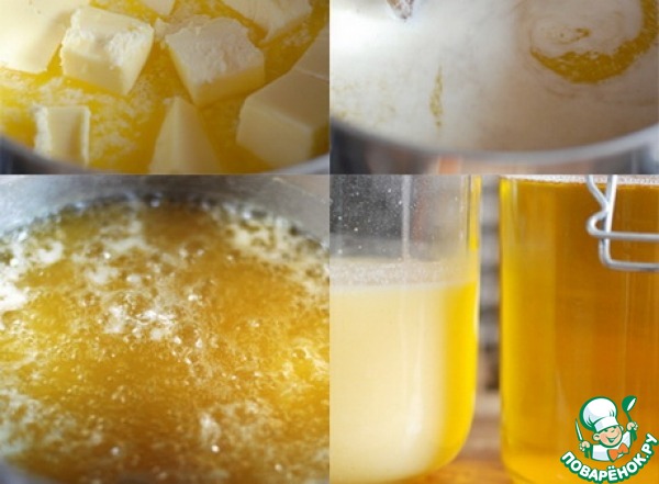 1. Берем эмалированную кастрюлю с толстым дном (чем толще — тем лучше). Кладем туда порезанное на куски сливочное масло и ставим на очень слабый огонь.