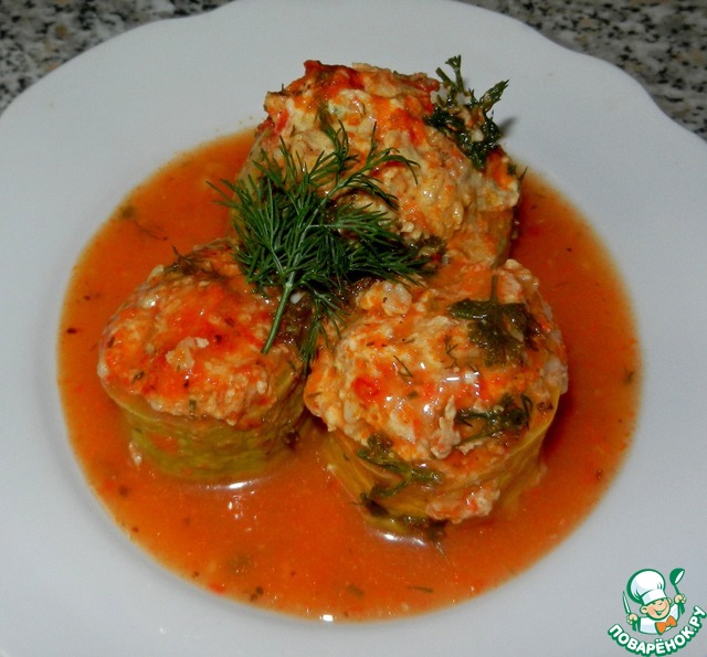 Фаршированные кабачки (куриная грудка и нешлифованный рис, томатный соус) Делала по своему рецепту, на сайте есть похожие