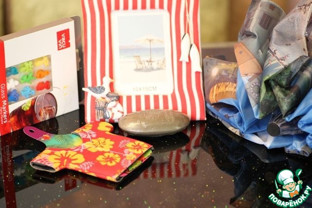 Красивейшая фото рамка, нам очень понравилась! Мыло с прекрасным запахом, пользуюсь с огромным удовольствием! Маркеры для бокалов, очень нужная вещь, когда дома больше 6-ти человек, а здесь у меня так часто