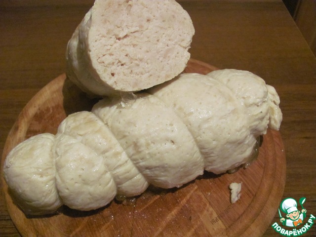 Это домашняя вареная колбаса по рецепту Bikcik.Очень вкусная: и на бутербродик и просто в ротик целеньким колечком! https://www.povarenok.ru/recipes/show/71217/