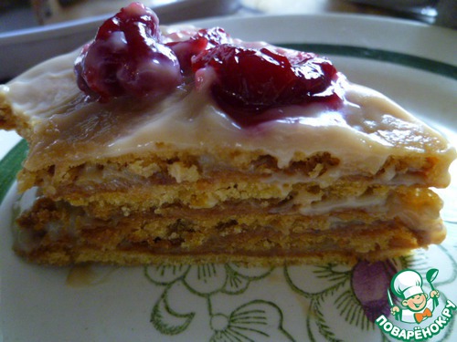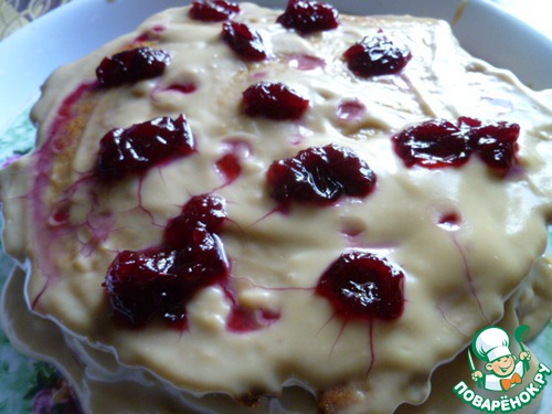 Готовые коржи я смазала обычным заварным кремом с добавлением черного шоколада. Сверху доченька украсила черешней, проваренной в сиропе. Торт пропитался за 1 час.