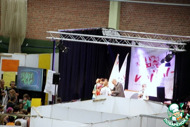 А там далеко,на сцене, самый настоящий бюргермастер/мэр города приветствует свои мини-копии