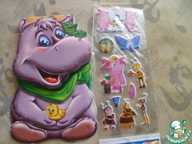 Для доченьки моей, кроме пружинки, Наташенька еще приготовила книжечку- бегемотик на украинском языке( за что огромное спасибо! Будем учить родной язык) и наклейки с Лунтиком.