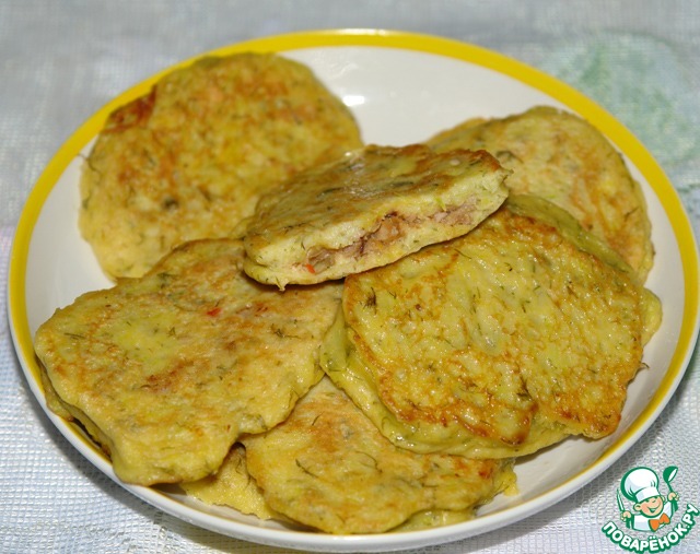Готовила по мотивам рецепта "Чебуреки" из кабачков, только не стала заморачиваться со складыванием, наливала ложку теста, сверху фарш и еще ложку теста сверху фарша, получилось типа беляшей