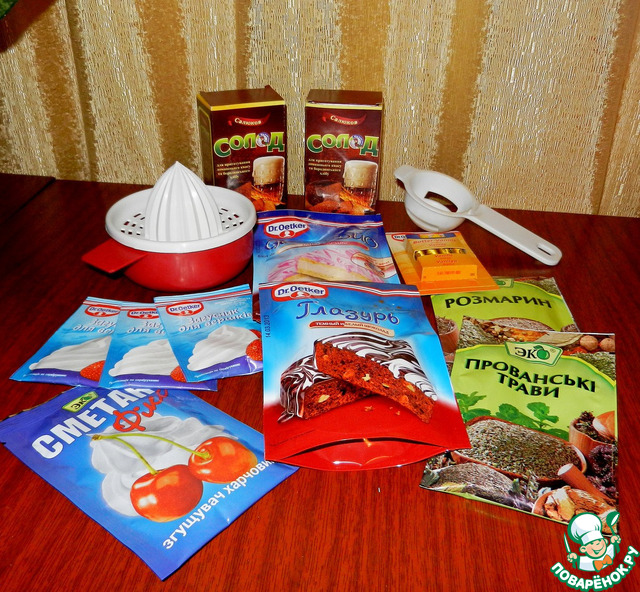 Дианочка прислала мне ручную соковыжималочку и разделитель для яиц разделителем уже пользовалась, ухты!! очень понравилось, фить-фить и готово, желточки целые, белки отдельно Также загуститель для сливок, глазурь тёмный/белый шоколад и йогурт/клубника; ароматизатор "Ваниль" ммм пахучка прованские травы и розмарин солод для прекрасных хлебушков