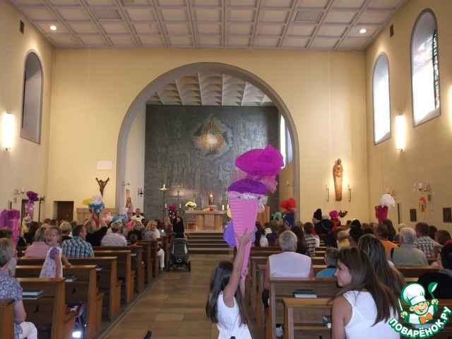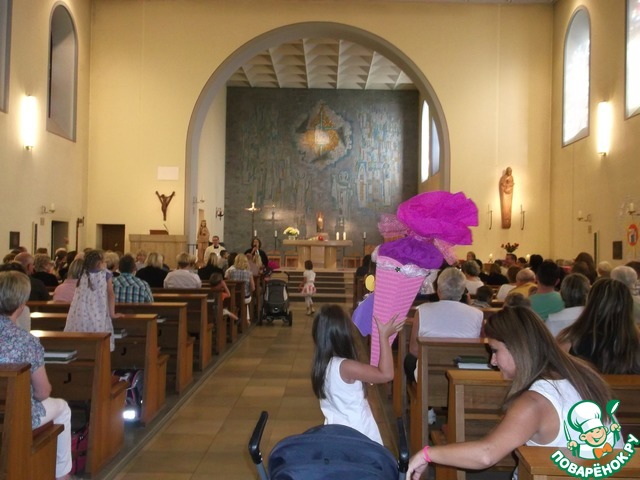 ), в руки взят огромный специальный колпак с подарками и сладостями, и мы отправились, вернее поехали, в... церковь.Да-да, сначала в церковь, где пастор поздравляет первоклашек с началом учебного года.