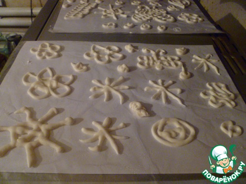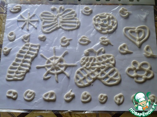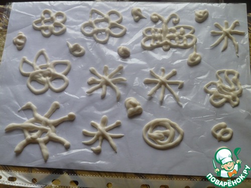 В толстом файлике отрезать уголок, совсем немного, чтобы рисовать. Затем помещаем в него айсинг и рисуем по шаблону. Я часть сушила на столе, часть на микроволновке, в которой пеклось печенье... Все отлично высохло, не ломается... Очень вкусно и просто!