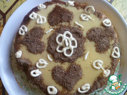 А вот и тортик... Я его делала на основе Идеального бисквита,не могу вспомнить чей рецепт... Затем переслаивала коржи кремом из сгущенного молока взбитого с сливочным маслом. Сверху украшала с помощью трафарета и тертого черного шоколада смешанного с сах.пудрой. И конечно же фигурки из айсинга!