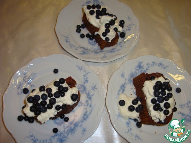 Бисквит со взбитыми сливками, присыпанный черникой. Это очень вкусно!