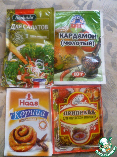 Вот еще специи: для корейской морковки, для салатов, кардамон и корица.