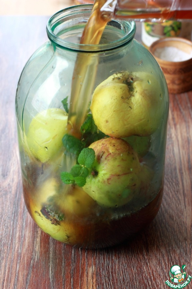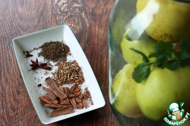 Добавьте пряности и травы. Ира предлагает взять душицу, зверобой и корицу. Я еще от себя добавила бадьян и одну гвоздичку. Сверху положите маленькую веточку мяты, она придаст особенный вкус яблочкам.