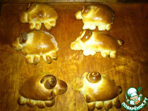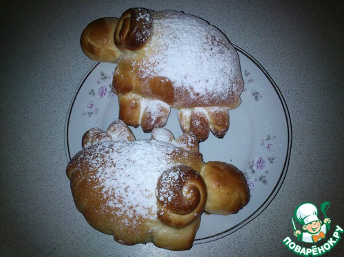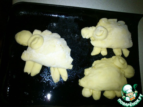 тесто легкое в выполнении, не липнет к рукам. расположились на кухне вокруг доски- еще бабушкино наследство- доска для раскатки выпечки. и давай ваять... через полчаса совместного труда, запыленные, но веселые выложили своих барашков на противешки и стали ждать -когда ж они поднимутся.. минут через 20 наши барашки потолстели, поднялись и отправились в духовку...