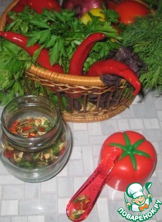 А вот сама идея мне очень понравилась. И с приобретением сушилки для овощей я ее воплотила в жизнь))). Для себя выбрала такой набор: сладкий перец, томат, перец острый, чеснок, лук репчатый и зеленый,укроп, петрушка, базилик. Томат сушу без кожицы и семян, перцы тоже без семян, остальное просто измельчаю. Мне нравятся крупные кусочки, но по желанию уже в сухом виде овощи можно измельчить и до порошкообразного состояния.