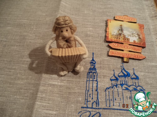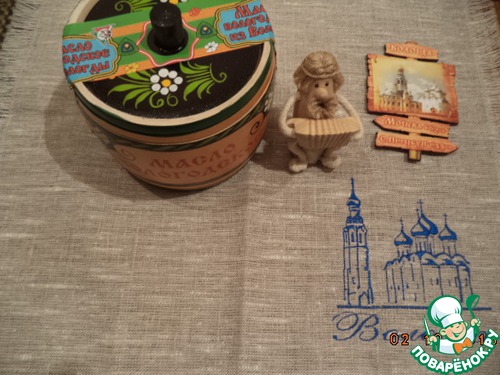 Замечательная салфеточка с надписью "Вологда", магнитик с видом города (уже на холодильнике красуется), замечательный дедок с гармошкой и - внимание! - горшочек вологодского масла!!!