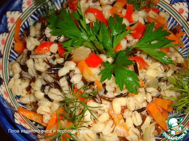 Плов из дикого риса и перловой крупы,приготовленный по рецепту Женечки Janecheh - очень вкусное самодостаточное блюдо,которое можно использовать и в качестве гарнира.