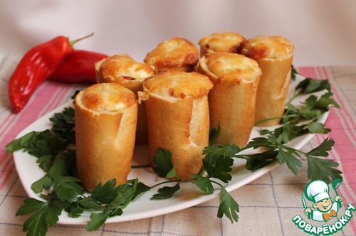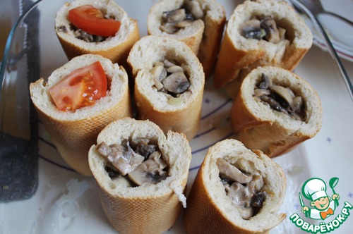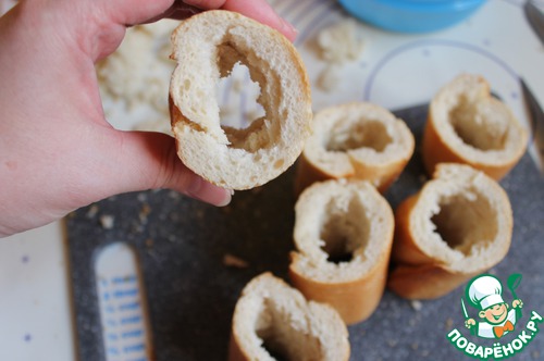 Порежем мелко куриную грудку. Или можно перекрутить через мясорубку. Обжарим одну луковицу и смешаем ее с фаршем. Солим и перчим. Пожеланию добавим чеснок. Грибы почистим, порежем и потушим. В конце добавим сливки. Багет разрежем на несколько частей. И удалим серединку.