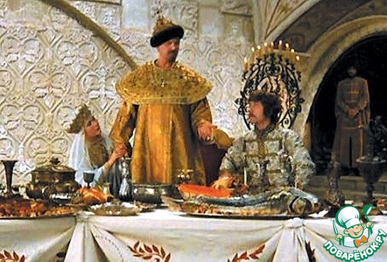 Сценарий к фильму «Иван Васильевич меняет профессию» Леонид Гайдай писал в соавторстве с Владленом Бахновым. Но фразу об икре черной, красной и заморской — баклажанной, которая звучит во время сцены пира, режиссер придумал сам. В начале 1970-х баклажанной и кабачковой икрой были заполнены прилавки всех магазинов, а красная и черная, наоборот, были деликатесом. Но несмотря на дефицит, Гайдай все же распорядился привезти на площадку все три вида продукта. Составив смету вместе с директором картины Александром Ашкинази, режиссер понял, что закупить настоящую еду выйдет дешевле и быстрее, чем изготовить бутафорскую. Сцену пира снимали несколько дней. Столы ломились от вкусного реквизита: молочные поросята, осетрина, десерты. А чтобы актеры и члены группы не съели раньше срока дефицитный реквизит, некоторые блюда облили керосином. Но это не помогло. Сцену делали в конце декабря, закончить работу до Нового года не удалось. Когда же 2 января группа вернулась в павильон, то обнаружила там пустые столы. Кто встретил праздник по-царски, неизвестно до сих пор.