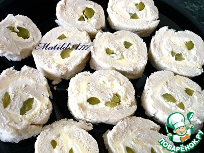 мажем пласт маслом, потом плавленым сыром, раскладываем маринованные огурчики и аккуратно заворачиваем с помощью плёнки. кладём в холодильник на несколько часиков, потом достаём и аккуратно режем на кусочки