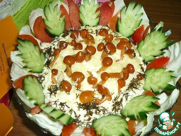 Рецепт: 1 слой положить пельмени,покрыть майонезом, 2 слой грибы+морковь+лук репчатый=все жарить и положить, 3 слой яйцо вареное, покрыть майонезом, сверку тертый сыр. Украсить торт грибами, свежыми огурцами, помидорами и зеленью.