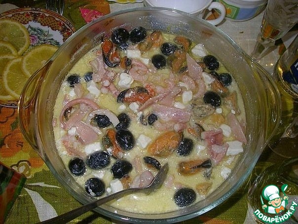 Морской коктель выкладываем в миску ( рассол выливаем в отдельную посуду для приготвления соуса) добавляем маслины ..режем кубиками сыр ..после берем наш рассол добавляем масла.. лимонный сок столовую ложку и заливаем этим соусом наш морской коктель ... чем больше соуса тем лучше ...)))