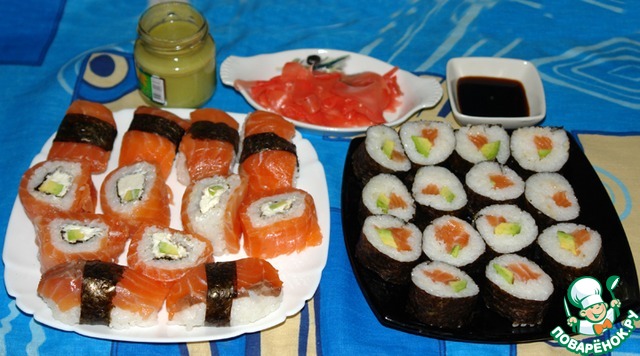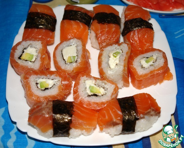 дык, муж в воскресенье вечером подошёл ко мне и спросил, как рис варить надо... объяснила... потом, когда он принялся за непосредственно работу со всеми продуктами: уложить, закрутить - подошла и в 4 руки мы живенько наделали суши )
