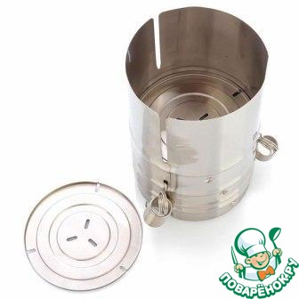 Дно и борта ветчинницы выкладываем фольгой. Заполняем форму. Накрываем форму крышкой и зажимаем пружинами. На дно колбы аэрогриля наливаем стакан воды, пива или вина. Помещаем форму в аэрогриль и готовим 60 минут при температуре 260°C.