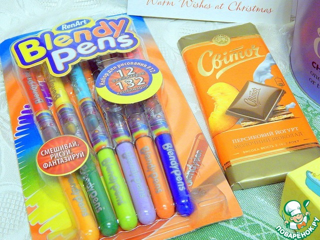 Это общий вид. А теперь подробнее. Детская часть подарка: двухсторонние фломастеры и шоколадка - еле удалось оставить в покое до фотосессии.