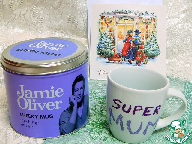 Ну и непосредственно моя часть подарка. Прелестная рождественская открытка с чудесными поздравлениями и пожеланиями, кухонное полотенце и персональная кружка "от Джейми Оливера". Кружка упакована в жестяную коробку. Маша этого знать не могла, но я просто влюблена в такие коробки. Сохраняю их и складываю в них свои мелкие сокровища и рукоделие. Так что я стала счастливой обладательницей не только стильной кружки, но и пополнила свою небольшую коллекцию коробочек.