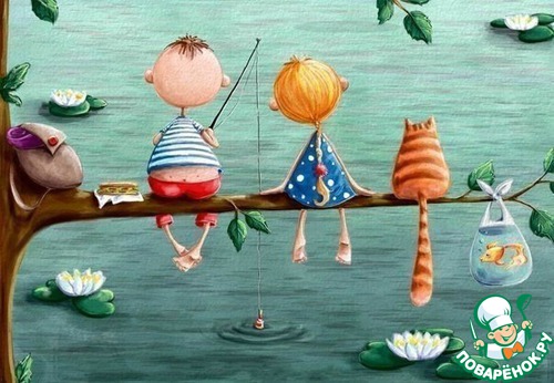 мальчик думает-быстрее бы рыбка клюнула, девочка-ну когда же он закончит, кот-как бы рыбку стащить, рыбка думает-ну все, это конец