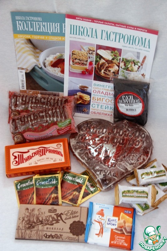 ...ммм, я знала, что Надюша - ч-к широкой души, но не могла предположить, насколько... широкой! Это только начало: пряники тульские на любой цвет и вкус, любого веса (от 500г !!! и по 250, но многААА...), шоколад 90%, рождественский чай, кулинарные журналы, замечательные и необыкновенные конфеты "яснополянские", уникальная "чёрная соль" сыпались из посылки щедрой рукой, как из рога изобилия: