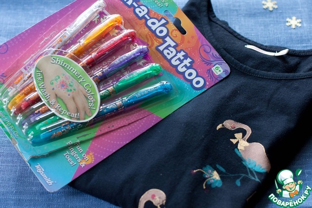 - Подарки Марусе - фломастеры-татушки и очень стильный трикотажный блузон. Причем Маша-старшая абсолютно точно попала в цвет, у Маши-младшей сейчас любимый цвет одежды - черный. Сидит сейчас вся в татушках, в черном подаренном блузоне, черных джинсах и с фингалом под глазом - каталась возле школы на льду и упала бровью. Моднаааая! ))) Завтра в школу не пойдет - отпросила.)