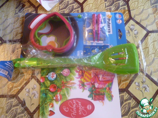 Открытка, заколки, силиконовая лопаточка и силиконовые формы для яичницы.