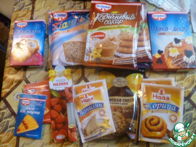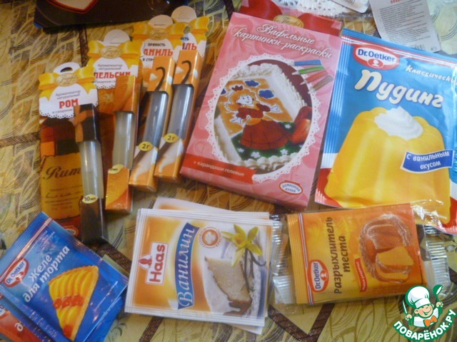 Ароматизаторы: ром и апельсин, ваниль в стручках, пудинг, еще ванилин и желе для торта, разрыхлитель теста, вафельные картинки-раскраски с пищевыми гелевыми фломастерами.